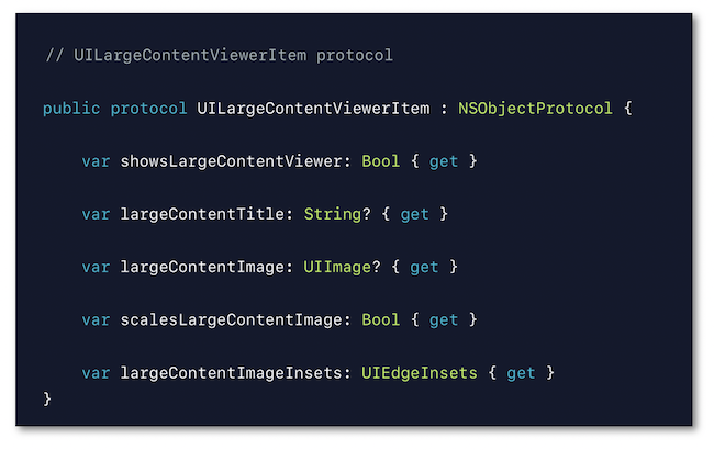The UILargeContentViewerItem protocol (05:35) defines the needed information for the large content viewer and is already implemented by the UIView class that provides setters as well (no need to subclass and override):