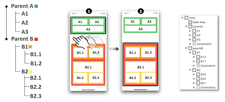 La structure utilisée pour l'exemple est présentée ci-dessous grâce à l'InterfaceBuilder de Xcode :