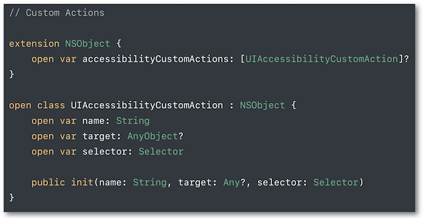 Il est possible de définir sur une vue un ensemble constitué de accessibilityCustomAction de façon à lui attribuer différentes actions possibles.
