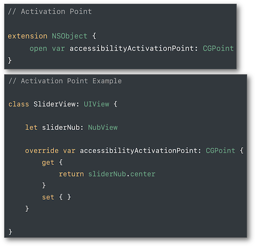 Il est donc possible de préciser à VoiceOver le focus de l'élément sélectionné grâce à l'attribut accessibilityActivationPoint de façon à indiquer finement à l'utilisateur où il se trouve au niveau du panoramique.