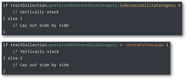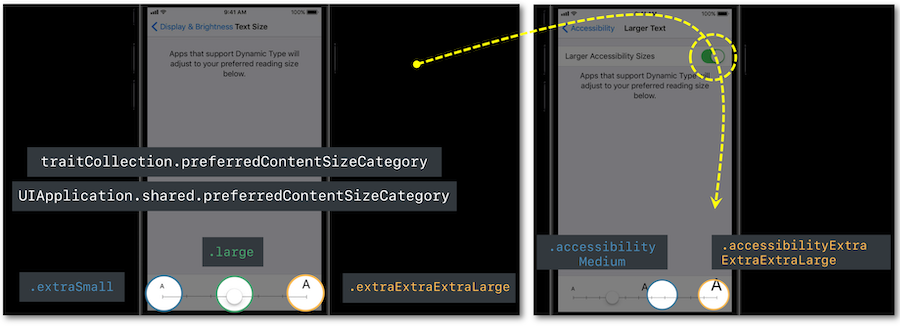 Ces différents seuils sont accessibles depuis le traitCollection de la vue ou bien directement depuis l'application par le biais de la méthode preferredContentSizeCategory.